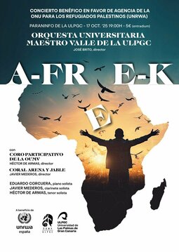 La Orquesta Universitaria Maestro Valle de la ULPGC, dirigida por José Brito, presenta su nuevo programa: A-FREE-K, una celebración del continente africano que contará con la colaboración del Coro Participativo de la OUMV, dirigido por Héctor de Armas, la Coral Arena y Jable, dirigida por Javier Mederos y la intervención como solistas del pianista Eduardo Corcuera, el clarinetista Javier Mederos y el tenor Héctor de Armas.